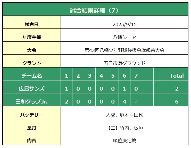2025-09-15 第43回八幡少年野球後援会旗親善大会 vs三和クラブJr.