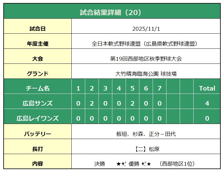 2025-11-01 第19回西部地区秋季野球大会 決勝 vs広島レイワンズ